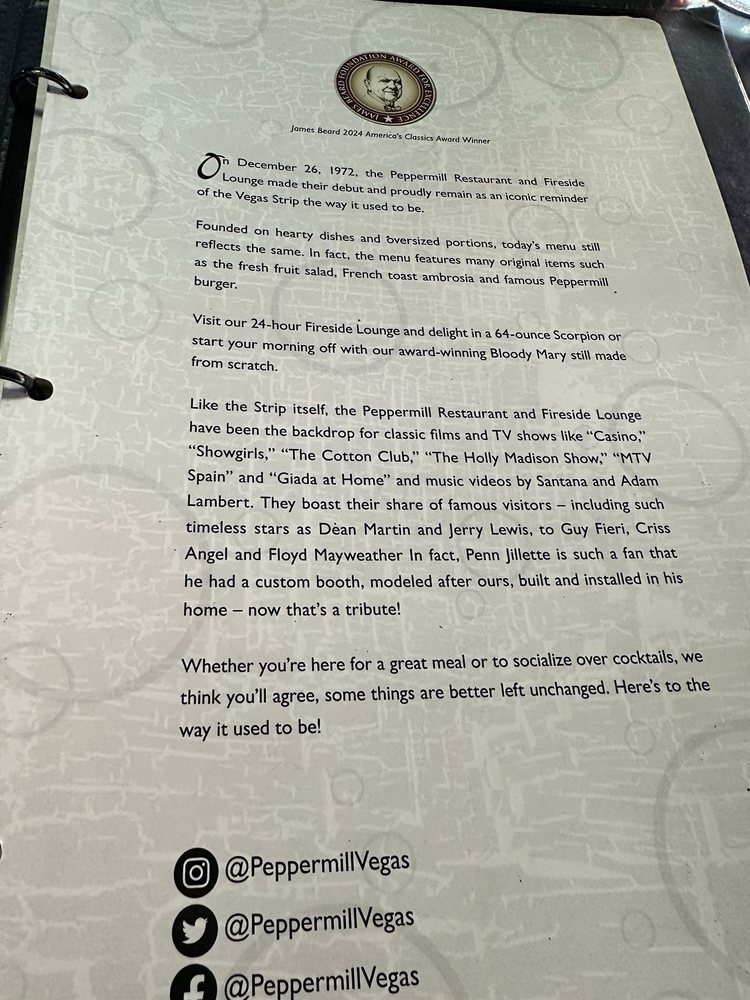 The Peppermill Restaurant & Fireside Lounge is a popular spot in Las Vegas, known for its American cuisine and cozy atmosphere. With a varied menu offering options for vegans and vegetarians, this lounge is wheelchair accessible and provides a comfortable dining experience. The shrimp cocktail and flatbread pizzas are standout appetizers, while the hearty soups and salads are perfect for a light meal. The burgers, including the Peppermill Pastrami Burger, are juicy and satisfying. Customers rave about the excellent service and relaxing ambiance, making it a must-visit destination. Don't miss out on the unique cocktails at the lounge, known for their sweet flavors. Overall, The Peppermill Restaurant & Fireside Lounge is a must-visit for those looking for a delicious meal in a welcoming setting.